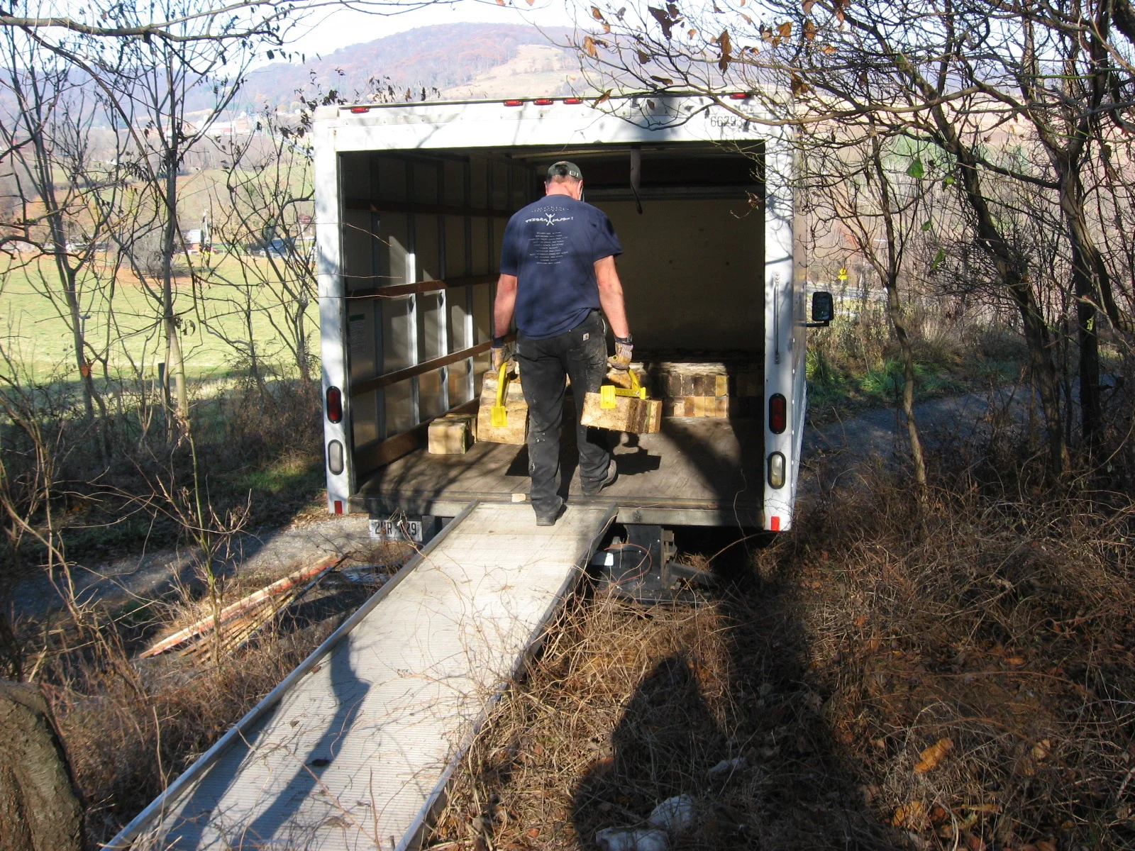 With Jackson as a co-driver and an early start of 5:30 am, I figured it would be about a twelve hour drive to Maryland. My estimate was accurate and after a good night’s sleep in a hotel and continental breakfast that wasn’t so good, we headed out to find the brick seller’s house, load up and head for home. The piles of bricks were stacked toward the back of the property, along a tree line. Given the property sloped up steeply from the house to the brick piles, Chris, the brick seller, suggested we access them from a utility road on the side of his property. We drove our 16’ Budget truck up the road and then backed into the bank alongside the brick piles getting as close as we could. Other than some old fencing, it was a pretty straight shot of fifty feet from the piles to the back of the truck. Jackson and I took turns with the brick carriers we had brought with us while the other made rows of brick to make it easier to grab each load. The bricks were larger than standard brick and so four in each carrier at a time was a load. At a little over twelve pounds each, a load with the two carriers was almost 100 lbs. I decided to spread the load out as much as possible so as to not overload any one part of the truck. Four hours later, we had all the bricks loaded, about 700 in all, paid Chris and after one more check of the truck’s leaf spring, which gladly hadn’t flexed much from the very heavy load, we started up the truck and headed for home. As soon as I pulled away from the bank, the truck body dropped about a foot and a half and I realized that the reason the springs hadn’t flexed much was because the truck’s bumper had become lodged in the bank and it was holding all the weight off the springs.